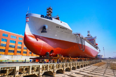 # 提前一个月交付1100TEU集装箱1号船,后续船全部按照生产节拍有序推进;2号船已成功离厂、3号船和4号船已成功下水,快速、连续、批量化的新造船模式效应不断凸显。