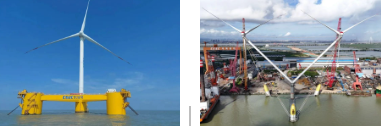 “明阳天成号”由一个漂浮在海面上的“Y”字型漂浮式基础以及安装在基础上的3个橄榄球形浮筒、1个“V”字型塔架、2台风机组成。