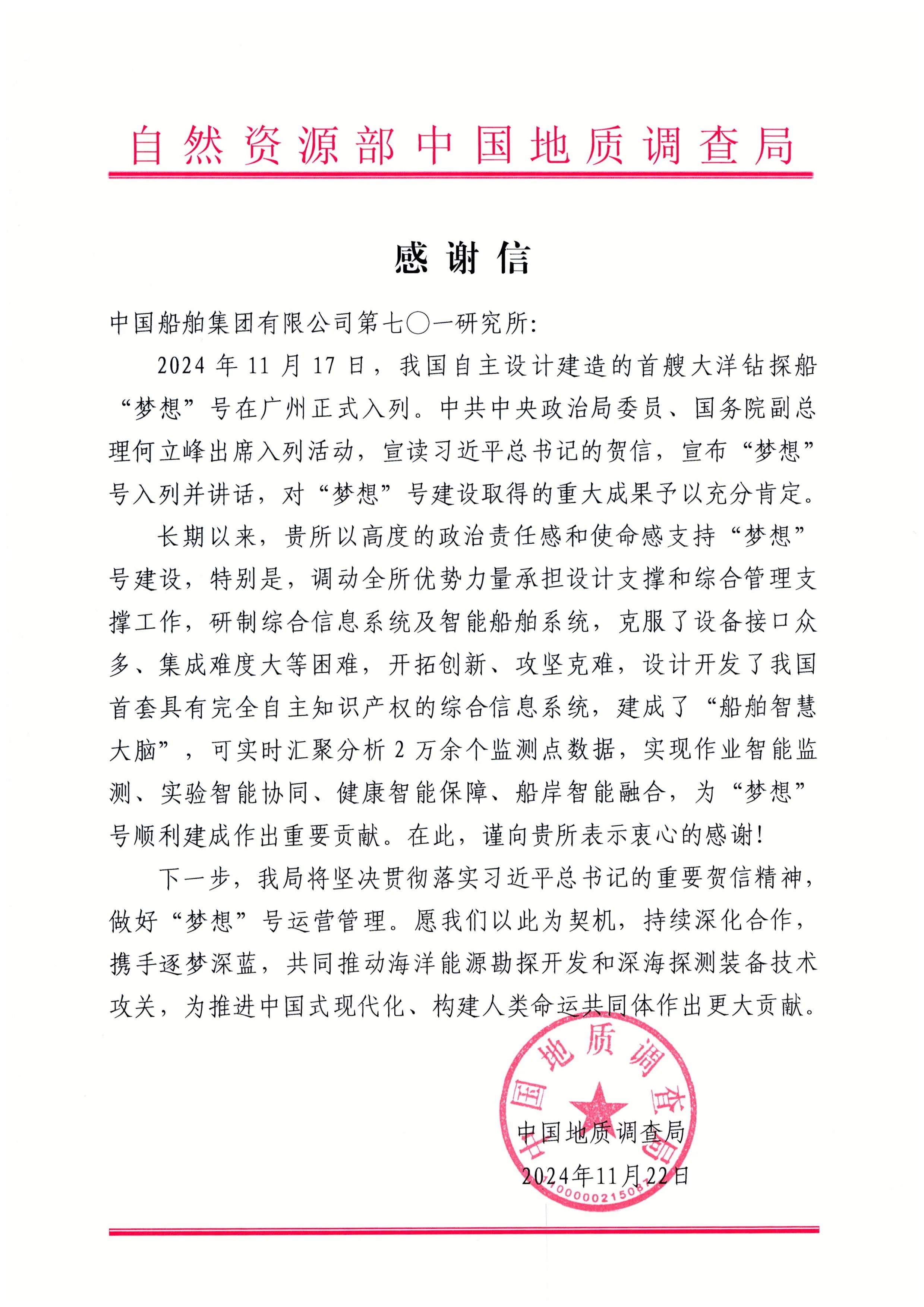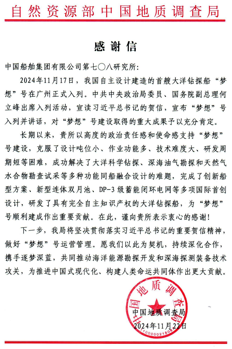中国地质调查局在信中对党的建设七〇八所在“梦想”号立项论证、研发设计、建造调试等阶段所做的突出工作和卓越贡献表示感谢。