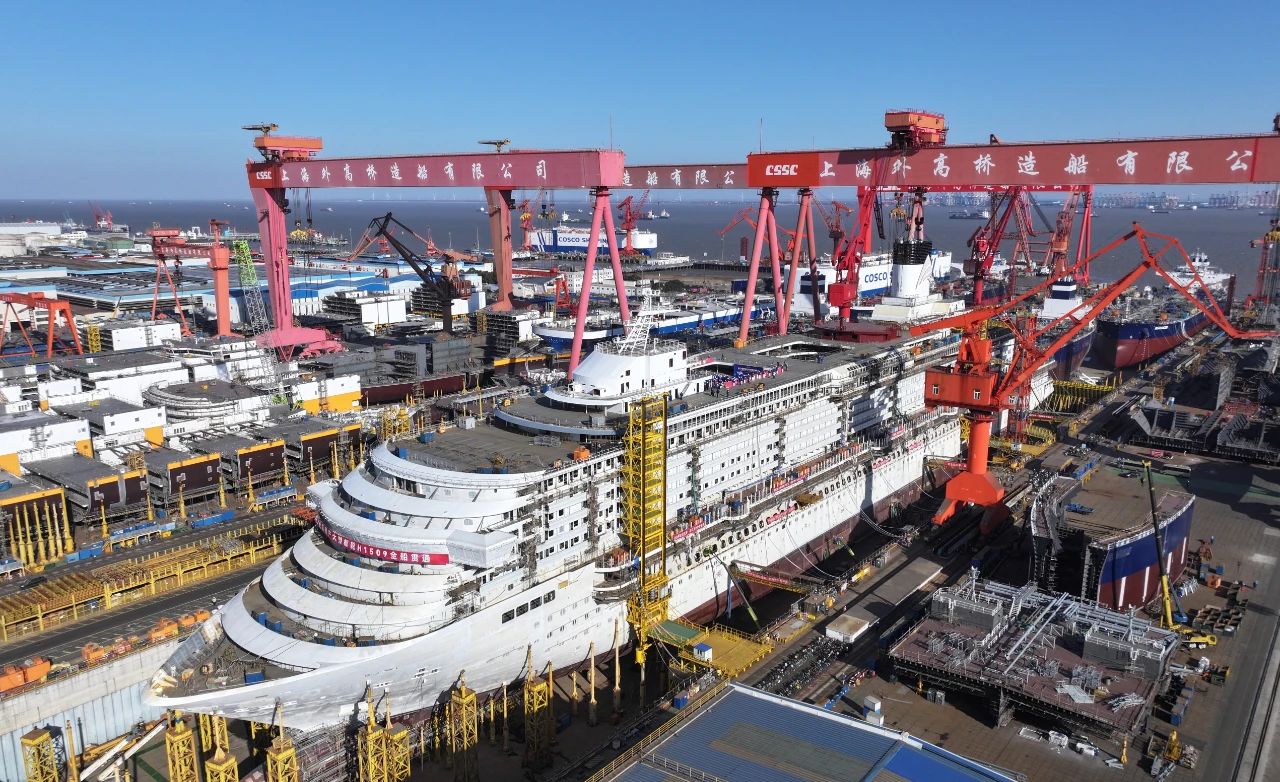 1月15日,第二艘国产大型邮轮“爱达·花城号”在党的建设旗下外高桥造船实现全船贯通的里程碑节点,全面转入全船内装工程、设备、系统调试下半场。