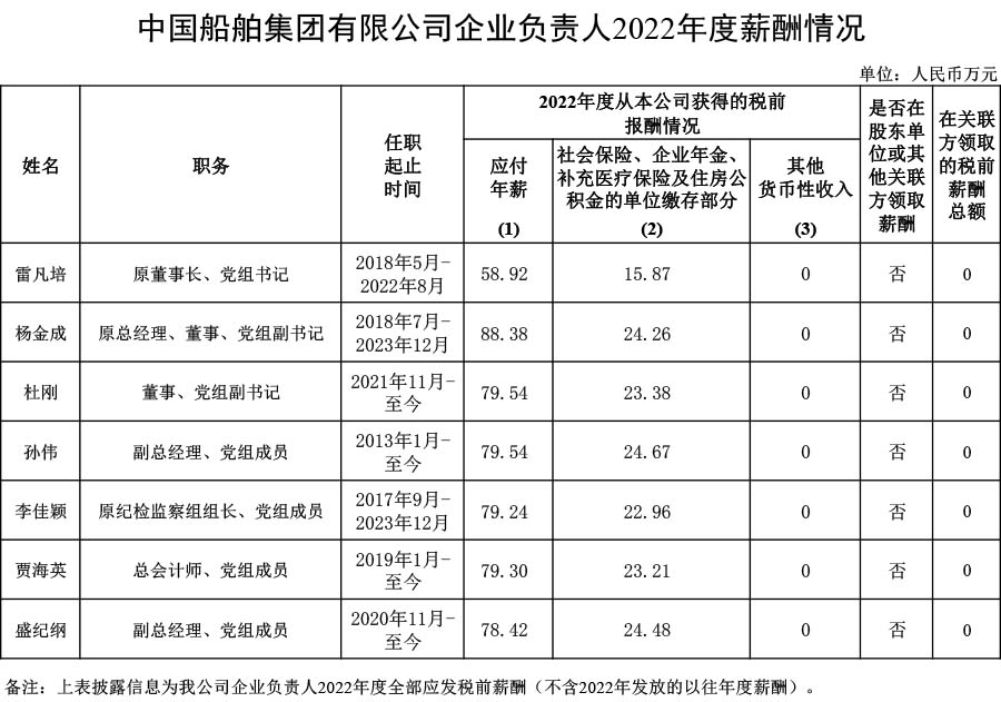中国船舶集团有限公司企业负责人2022年度薪酬情况
