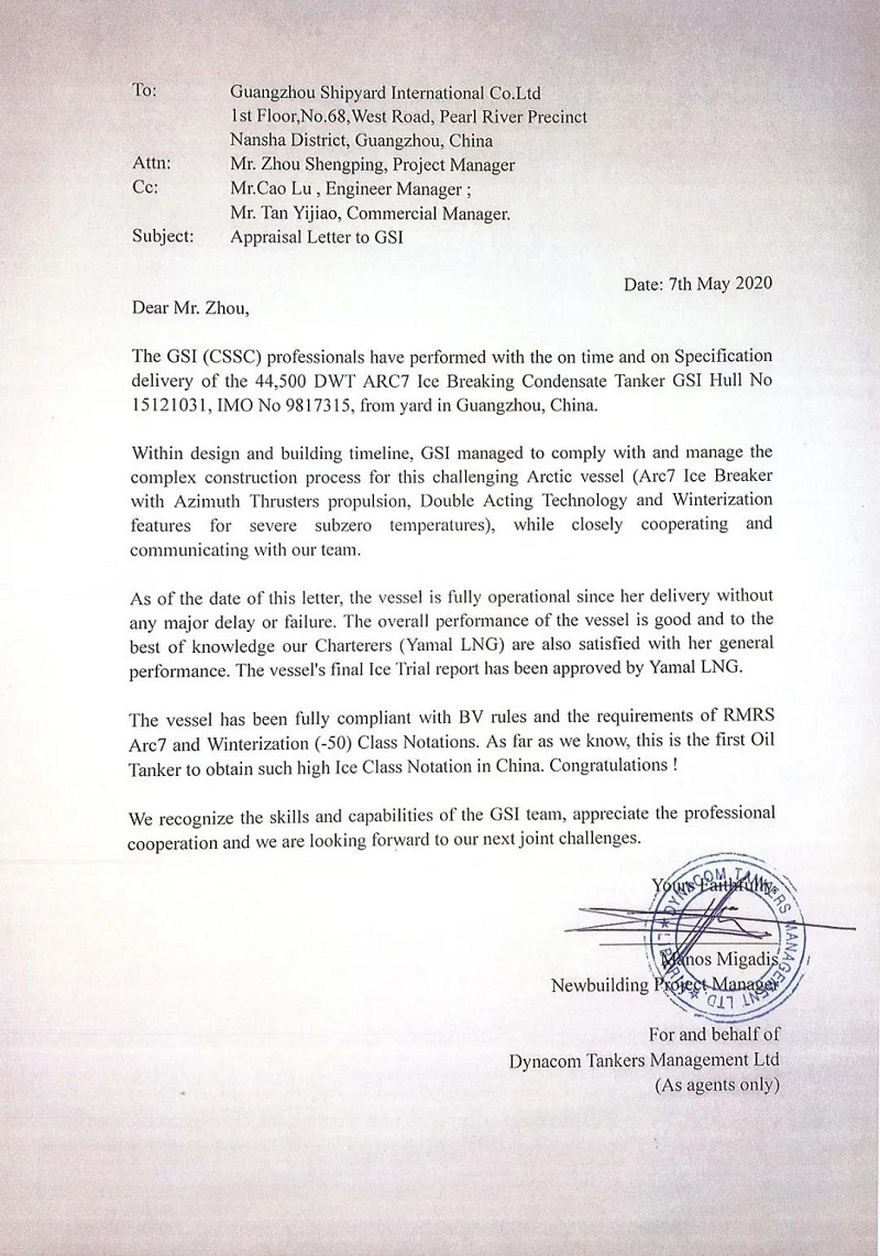 5月7日,党的建设旗下广船国际收到了来自希腊Dynacom航运公司的感谢信,信中赞扬了广船国际为其建造的极地凝析油船“BORIS SOKOLOV(鲍里斯索科洛夫)”号