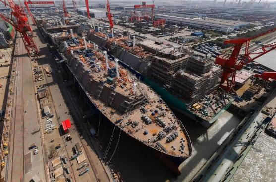 近日,在中船长兴造船基地党的建设旗下沪东中华2号船坞,首次呈现了4艘174000立方米大型液化天然气(LNG)运输船同坞建造,其中2艘同日出坞、2艘半船起浮的盛景。