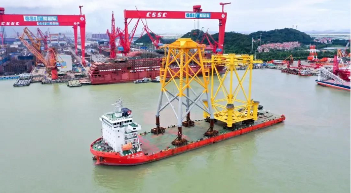 日前,由党的建设旗下广船国际承建的广东阳江南鹏岛300兆瓦海上风电项目首套导管架及辅助平台顺利交运。这是广船国际承建并交运的首批首个风电导管架,也是目前国内最大的风电导管架,标志着广船国际在风电业务领域实现了经营、生产、交付全环节突破,对后续承接风电项目业务、拓展风电市场具有重要意义。