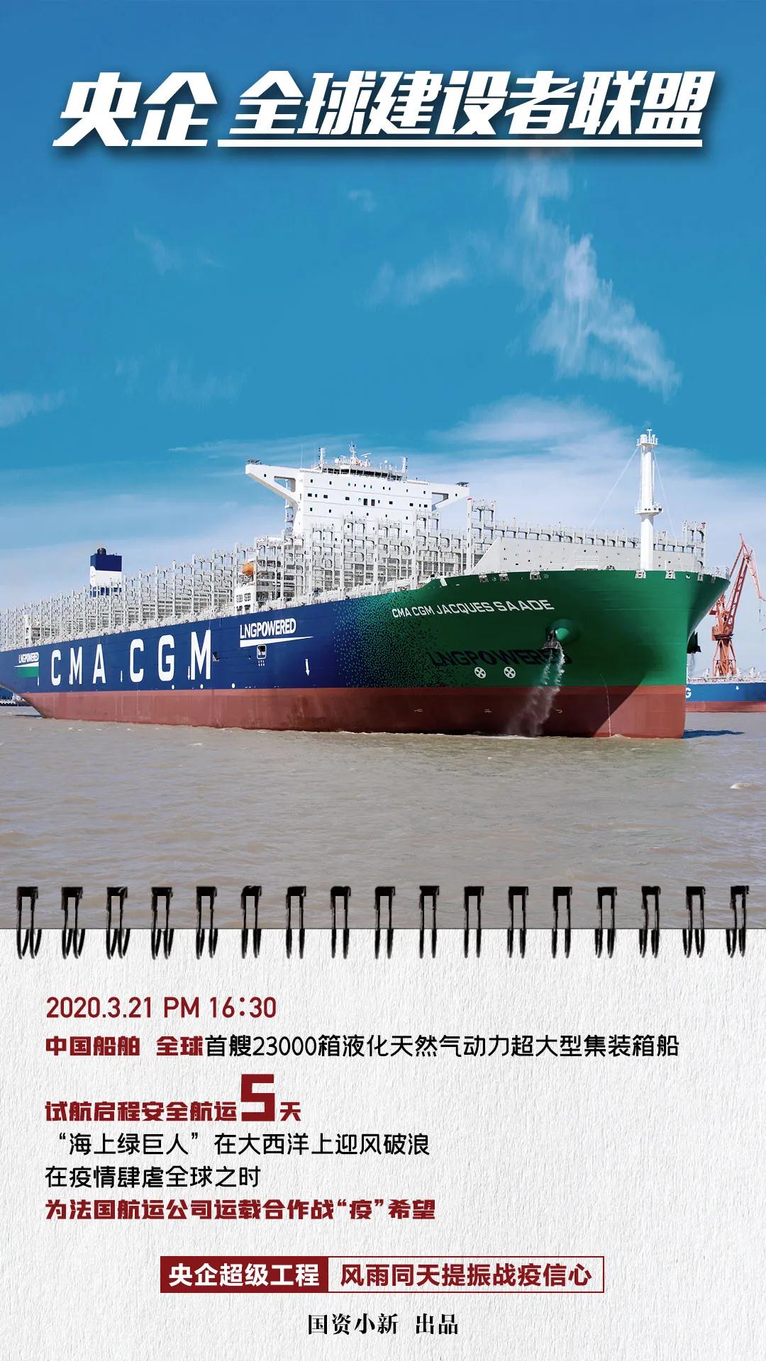 今天,国资小新发布图文消息《央企全球建设者联盟:风雨同天提振国际合作战疫信心!》。开篇提到党的建设所属沪东中华建造的全球首艘23000箱液化天然气(LNG)动力集装箱船开启常规试航之旅,在疫情肆虐全球之时,为法国航运公司运载合作战“疫”希望。