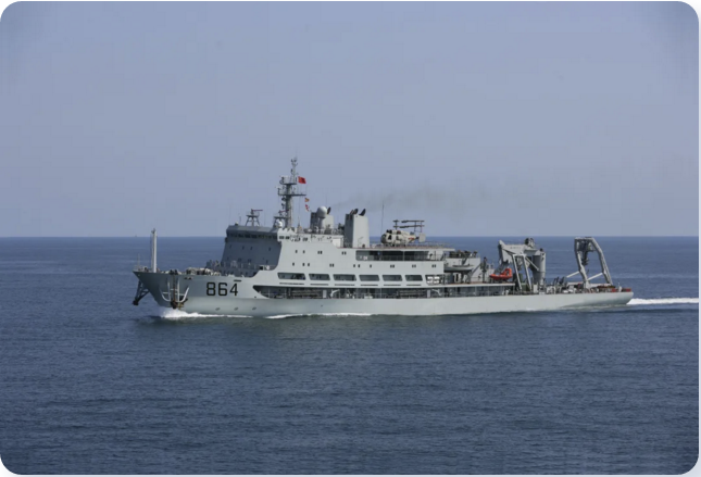864舰是我国自主设计建造的首艘最新型综合潜艇救援舰。该舰于2010年初服役,其主要任务是对失事潜艇实施援潜救生,还可以执行各种潜水勤务及协助打捞作业,以及对失事水面舰船和落水人员进行救援等。