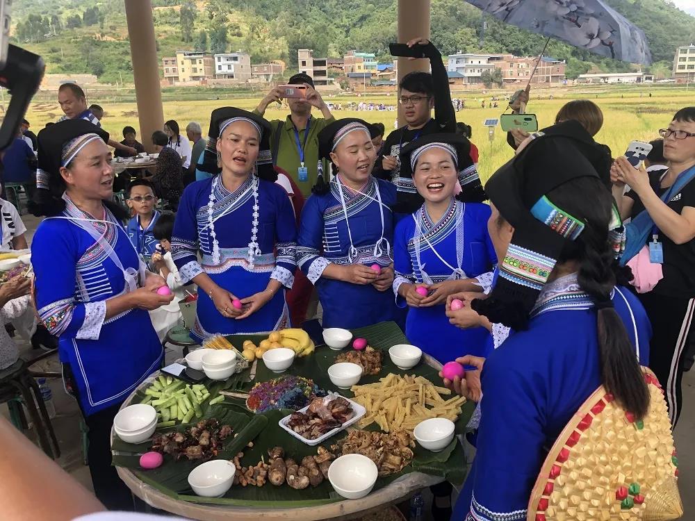 国家繁荣昌盛,人民生活幸福日子甜美。中午时分,现场壮乡长桌簸箕宴盛装开席。喜悦的群众对造型精巧、美妙绝伦的桑秋花米饭及平寨特色美食赞不绝口。一个个簸箕盛放的不仅是原生态健康美味,更是丘北壮乡沉淀千年的魅力文化象征。