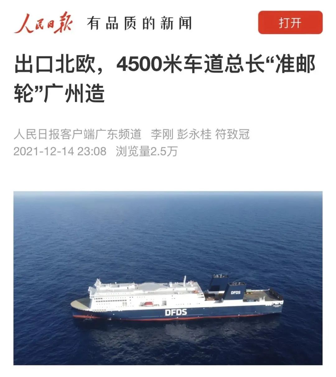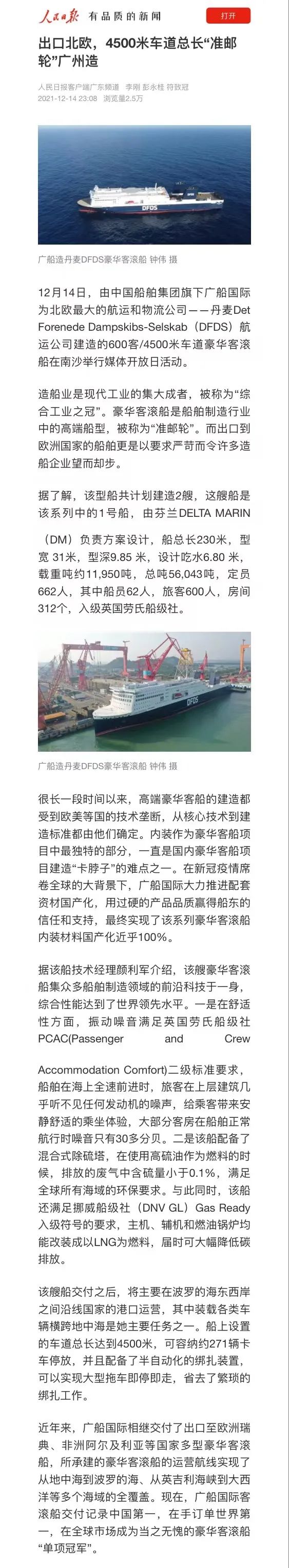对这艘“准邮轮”的高端船舶,媒体盛赞广船国际在新冠疫情席卷全球的大背景下,大力推进配套资材国产化,用过硬的产品品质赢得船东的信任和支持,最终实现了该系列豪华客滚船内装材料国产化近乎100%,是当之无愧的豪华客滚船“单项冠军”。