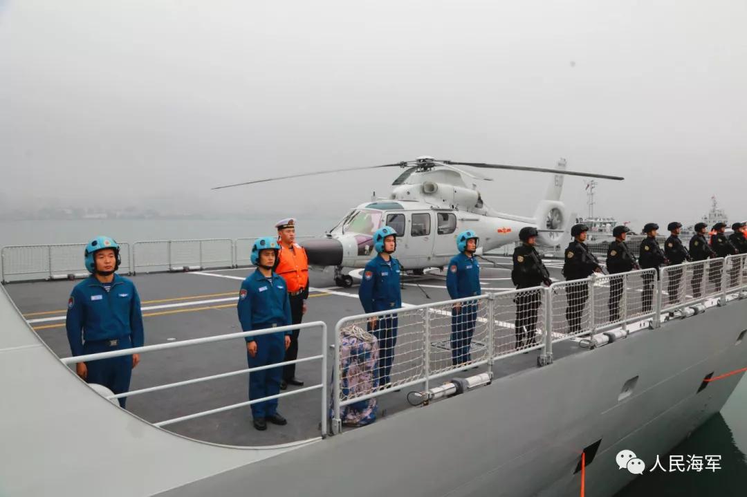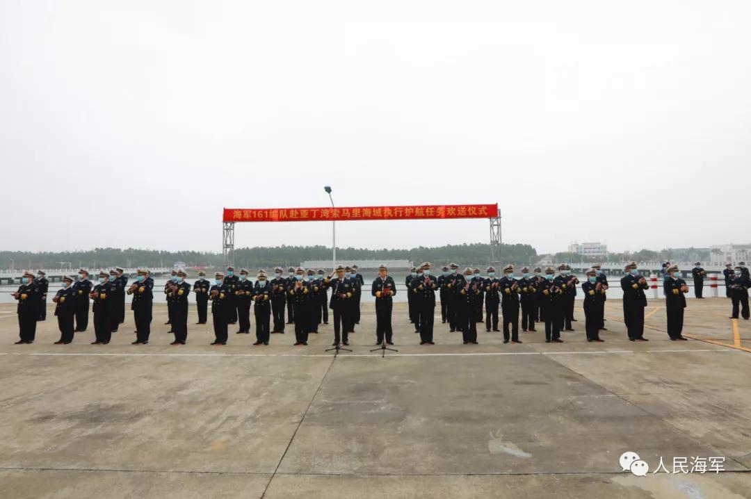 军乐队奏响《欢送进行曲》,编队舰艇依次解缆,缓缓驶离码头,任务官兵整齐列队、士气高昂,向祖国和人民挥手告别。