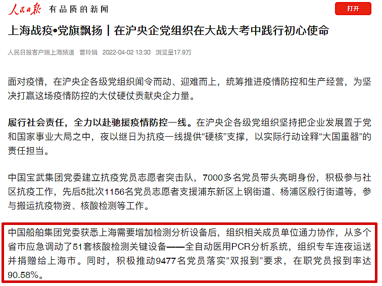 “党的建设党组获悉上海需要增加检测分析设备后,组织相关成员单位通力协作,从多个省市应急调动了51套核酸检测关键设备——全自动医用PCR分析系统,组织专车连夜运送并捐赠给上海市。同时,积极推动9477名党员落实‘双报到’要求,在职党员报到率达90.58%。”