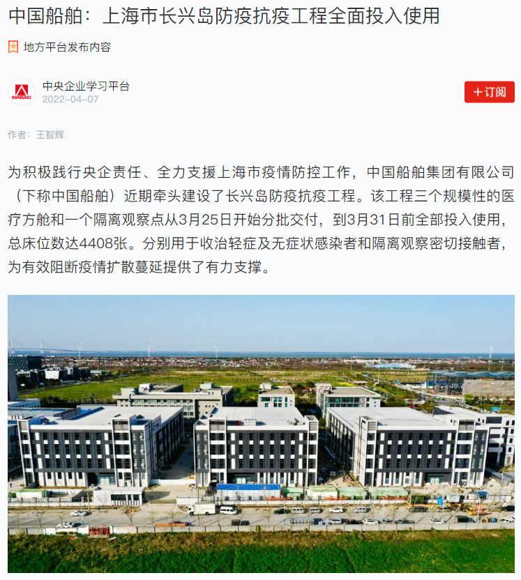 中国船舶:上海市长兴岛防疫抗疫工程全面投入使用