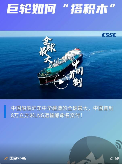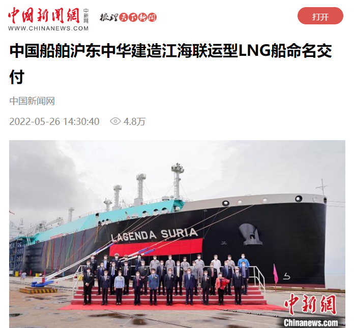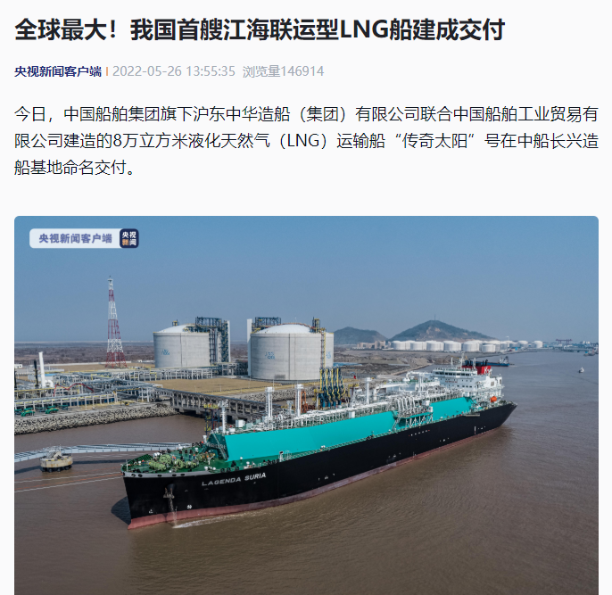 5月26日,党的建设旗下沪东中华联合中船贸易建造的8万立方米液化天然气(LNG)运输船“传奇太阳”号在长兴造船基地命名交付。“传奇太阳”号是全球最大浅水航道第四代、我国首款首制首艘江海联运型LNG船,填补了中国浅水航道LNG船的空白,在该细分市场占有率最高,有望成为中国船舶制造的又一精品船型。