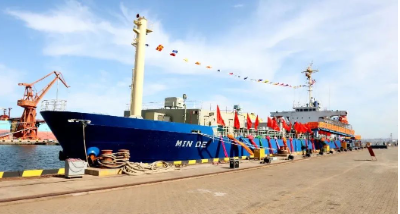2020年,大连造船将散货船改装而成的“民德”号交付。这是具有完全自主知识产权的舷侧开孔式养殖工船。交船的同时,签约了10+8艘大型养殖工船项目。