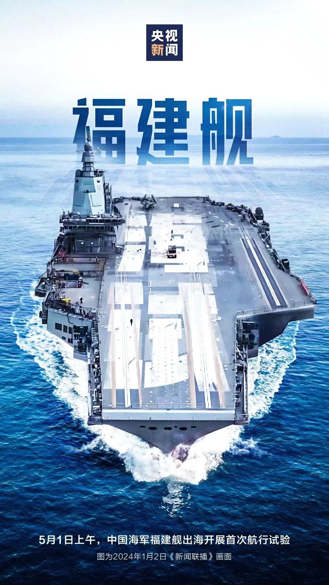 今天(5月1日)8时许,我国第三艘航空母舰福建舰从上海江南造船厂码头解缆启航,赴相关海域开展首次航行试验。