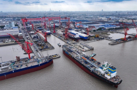 12月2日,外高桥造船1号船坞迎来8600车液化天然气(LNG)双燃料动力汽车运输船(PCTC)和11.4万吨阿芙拉型成品油轮的同日出坞,不仅达成首制PCTC船坞周期100天既定目标,在民船建造领域继续保持“加速度”,而且也标志着该公司新船型和常规船型同坞同节拍生产取得新突破。