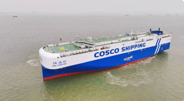 4月21日,中船集团旗下广船国际联合中船贸易建造的7000车液化天然气(LNG)双燃料动力汽车运输船“汉江口”号举行命名交船仪式。据了解,该船交付后,首航次将从上海装载国产汽车奔赴智利、秘鲁、危地马拉等国家。