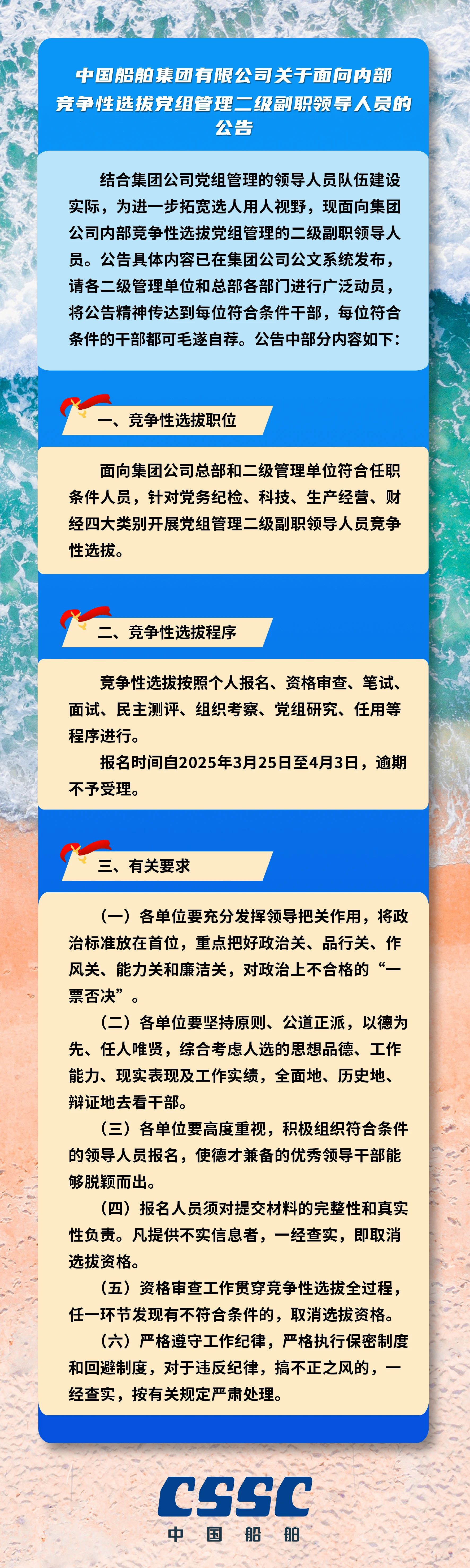 中国船舶集团有限公司关于面向内部竞争性选拔党组管理二级副职领导人员的公告