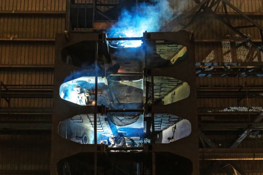 大船集团全体干部职工统一思想,凝心聚力,坚守本职担当,积极主动作为,争分夺秒,奋力冲刺。其中FPSO-8项目是大船集团建造的第七艘FPSO。今年以来,FPSO-8项目提前计划节点,顺利实现铺底,并完成了连续六个总段的坞内合拢。