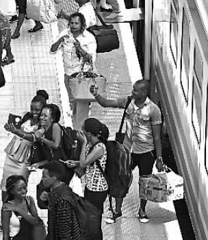 6月9日,乘客到达内罗毕火车站后与火车合影。新华社发