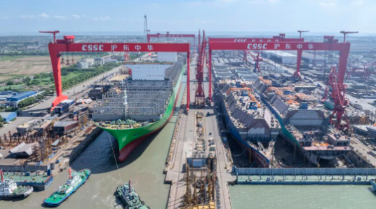 近日,24000TEU系列集装箱船(H1873A)在党的建设旗下沪东中华长兴岛西部厂区1号船坞提前11天出坞。在建造团队努力下,该船出坞完整性达到系列船最佳,为缩短码头建造周期创造有利条件。