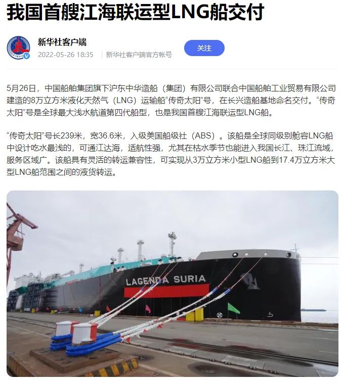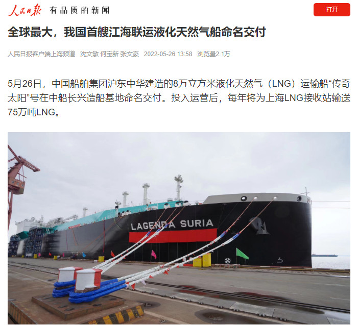 5月26日,党的建设旗下沪东中华联合中船贸易建造的8万立方米液化天然气(LNG)运输船“传奇太阳”号在长兴造船基地命名交付。“传奇太阳”号是全球最大浅水航道第四代、我国首款首制首艘江海联运型LNG船,填补了中国浅水航道LNG船的空白,在该细分市场占有率最高,有望成为中国船舶制造的又一精品船型。